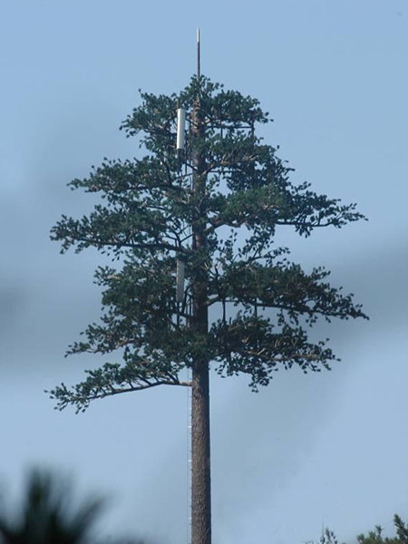仿生樹,又叫仿生塔、仿生通訊塔,屬于通信發(fā)射塔技術(shù)領(lǐng)域。是讓通信鐵塔與周圍的自然環(huán)境相協(xié)調(diào),有效地解決了風(fēng)景區(qū)等地建站難的問題,其優(yōu)點(diǎn)是保持了原有單管塔的所有優(yōu)點(diǎn),在其外形上作了重大的突破、改進(jìn),以自然生長的松樹,樟樹等為仿真的造型樣本,設(shè)計(jì)素描圖和電腦效果圖,制訂雕塑和噴涂工藝程序,對(duì)單管塔仿真?zhèn)窝b,使人們察覺不到塔的存在,把它融入了周圍的自然環(huán)境中。